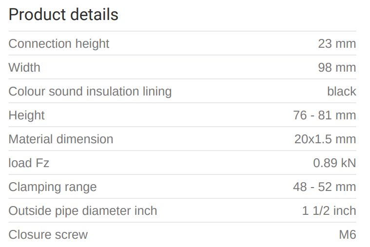 Rörafesting frá MEFA úr galvaniseruðu stáli með einangrunGerð: Trabant 20x1,5 48 - 52 mm M8/M10 TPEStærð: 48 - 52 mmNafnmál Ø: 1 1/2"Skrúfgangur: M8 / M10Einangrun úr gúmmíMagn: 50 stk