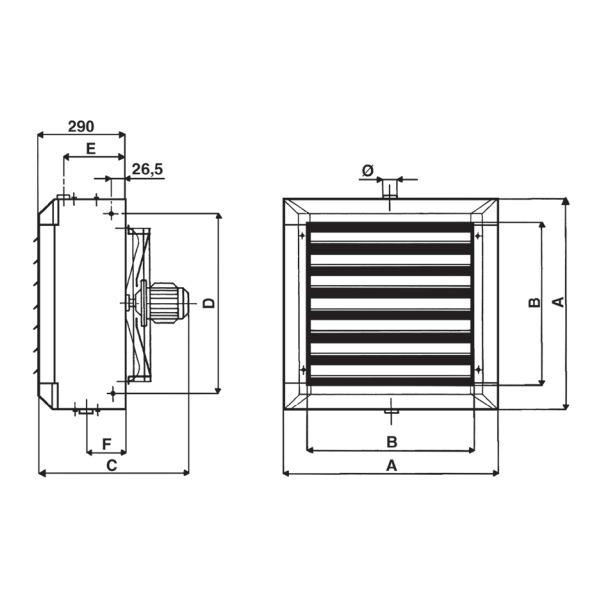 Atlas vatnshitablásari AS-ECM 43 frá SabianaHitaafköst 19,4 kW við 80/40-20°CEC mótor fyrir 1x230 VAC og 0-10 VDC stýristraumHljóð dB(A) 57,0 í 5 m (EN 3744)Stærð 634 x 634 mm