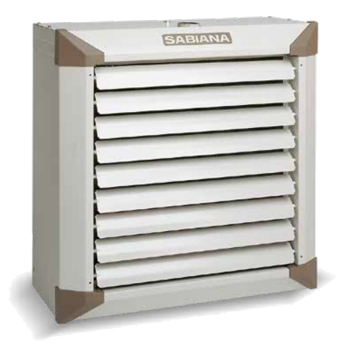 Atlas vatnshitablásari AS-ECM 63 frá SabianaHitaafköst 25,4 kW við 80/40-20°CEC mótor fyrir 1x230 VAC og 0-10 VDC stýristraum.Hljóð dB(A) 61,0 í 5 m (EN 3744)Stærð 742 x 742 mm