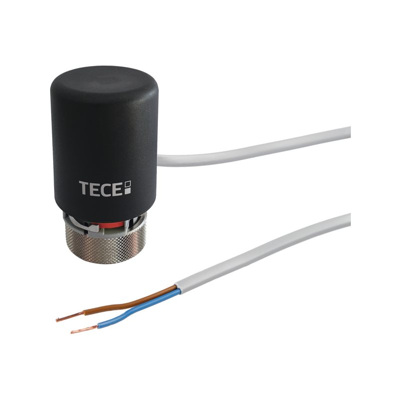 Thermal servomotor, operating mode normally closed (NC), for mounting on the return valves of the TECEfloor SLQ heating circuit manifold. Opened at the factory (first-open function), facilitates easy screwing onto the control valves and filling and flushing the system. The servomotor can be opened again at any time for servicing (re-open function). Protection class IP 54, therefore mountable 360° in any position. Robust union nut connection M 30 x 1.5 mm made of nickel-plated brass, lifting and closing dimension tailored to TECEfloor heating circuit manifolds, connection voltage 24 V/230 V.